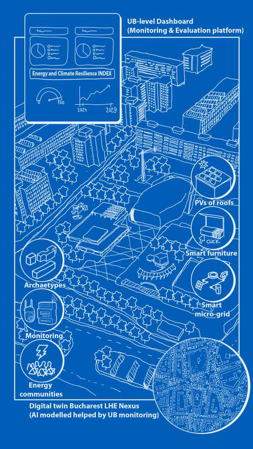 RES integrat la nivel multi-scalar: biosolar pe blocul pilot, micro-rețele în spațiul public, mobilier urban smart.
